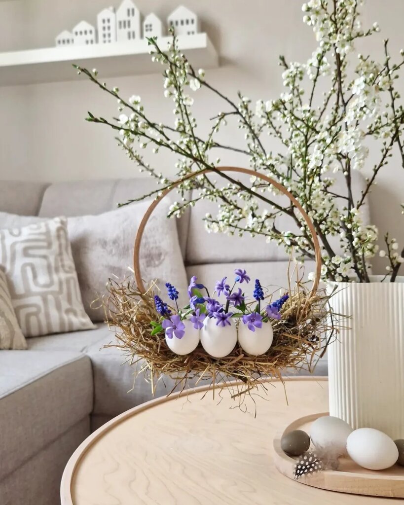 The white eggshell containers highlight the deep purple and creamy white blooms perfectly, giving a crisp, natural contrast. You can tweak this idea by adding tiny feathers or hay around the base, just like @fru.lily did, to add texture and softness to the display.